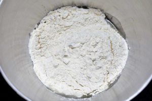 - Во сад за матење додадете вода, масло, шеќер и сол. Додадете ја смесата со брашно во течните состојки во садот за месење.150 мл вода, ½ лажичка шеќер, ½ лажичка сол, 2 лажици масло
