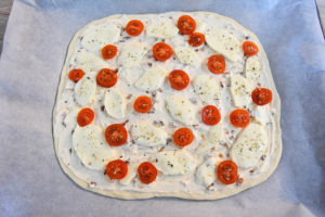 - Додека тестото мирува, исечете ја моцарелата на кришки.200 гр моцарела