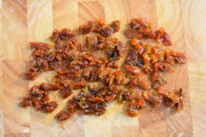 - Исушените домати исечкајте ги многу ситно.3-4 сушени домати во масло