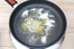 - Во голема тава ставете ги путерот и шеќерот, загрејте и оставете малку да се карамелизираат.2 лажици шеќер од сурова трска, 10 гр путер